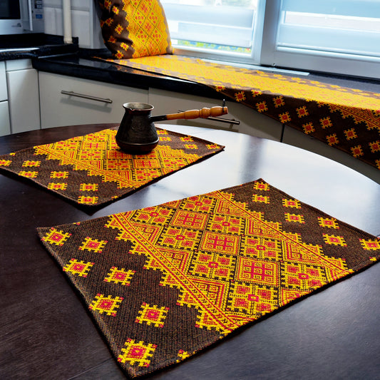 Ukrainian Placemats set of 2 Сenterpiece Woven Fabric Brown with yellow ornament, table decor