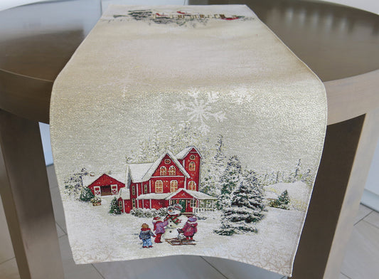 Table Runner Christmas Golden Threads Lurex Fabric Tapestry Rectangular Napperon Snowmen
