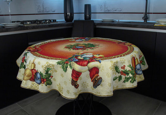 Round Christmas Tablecloth Red Santa Gifts Table Linen with Gold Lurex