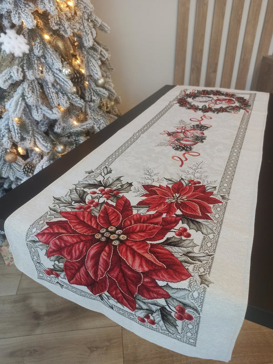 Christmas Table Runners White with Silver threads, Tapestry Fabric, Red Poinsettia