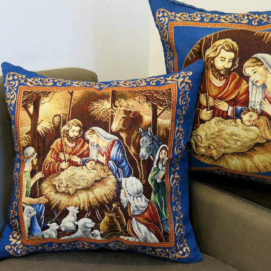 Throw Pillow Covers Nativity Blue Christmas Christian icon Jesus Birth Cushion Cover with Golden threads18in