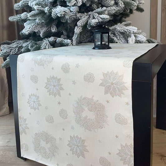 Christmas Table Runners Ivory with Silver threads, Tapestry Fabric, Christmas Cones
