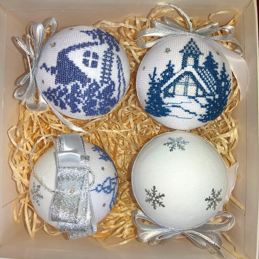 Holiday Christmas ornaments Set of 4 handmade White Embroidered Christmas balls Christmas village