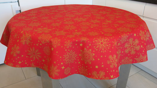Round Tablecloth Christmas Red with Yellow Snowflakes Waterproof Fabric Dirt resistant Table Cover