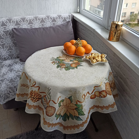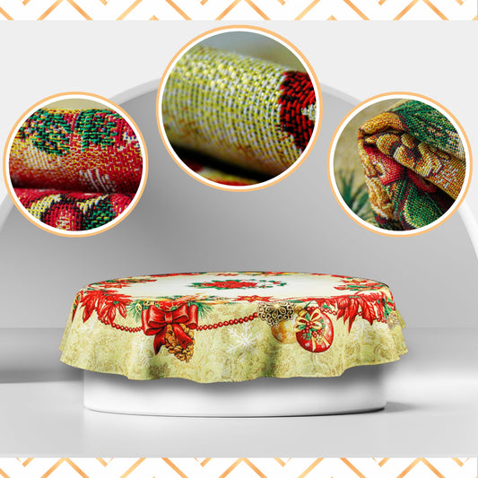 Round Christmas Tablecloth Golden Red Poinsettia X-mas Table Linen with Gold Thread
