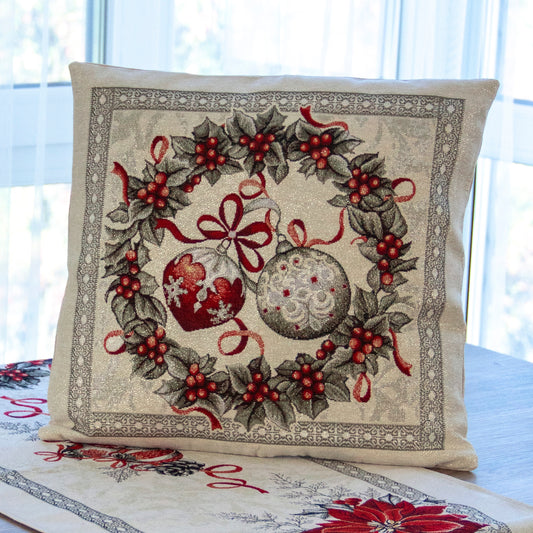 Christmas Cushion Cover White Red 18in Silver Christmas Wreath Silver Threads Decorative Pillowcase