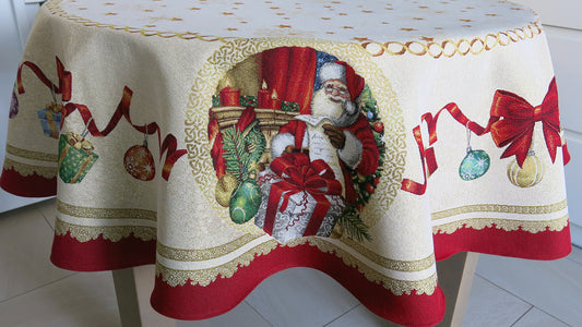 Round Christmas Tablecloth Red Santa Gifts Table Linen with Gold Lurex