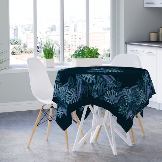 Tablecloth Blue Cotton Dark Blue Square with Tropical Monstera Palm Leaves for Square Round Table
