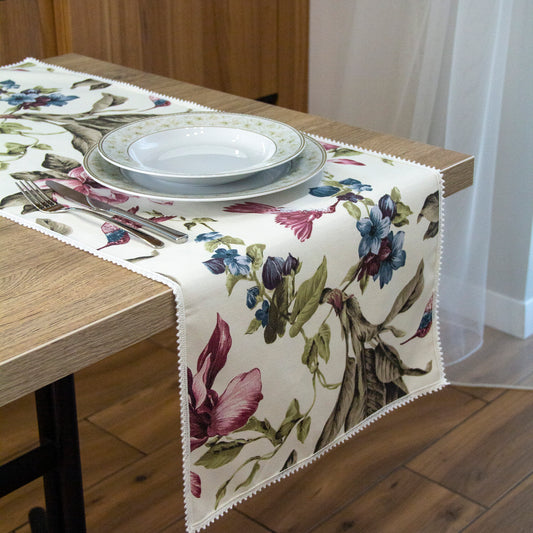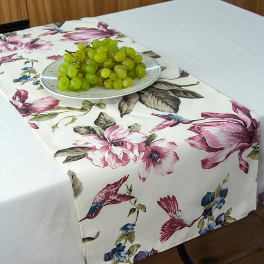 Decorative Runner on the Table Waterproof Rectangular Hummingbird white with Colored Flowers.